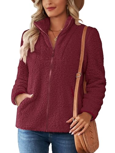 Nilimoph Womens Fleece Jumper Teddy Fleece Jacket Sweatshirts Casual Jumpers Top Fuzzy Full Zip Up Long Sleeve Stand Collar Cozy Coat Tops with Pockets (Z Wine Red, L)
