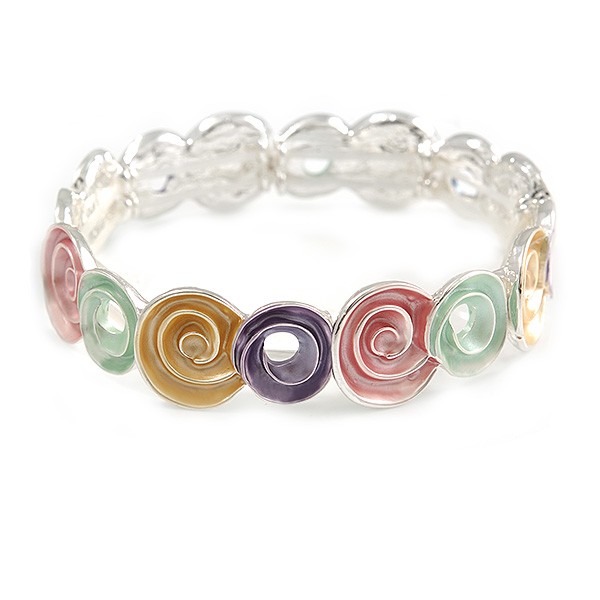 Pastel Multi Enamel Twirl Disc Flex Bracelet In Silver Tone - 18cm Long (Medium)
