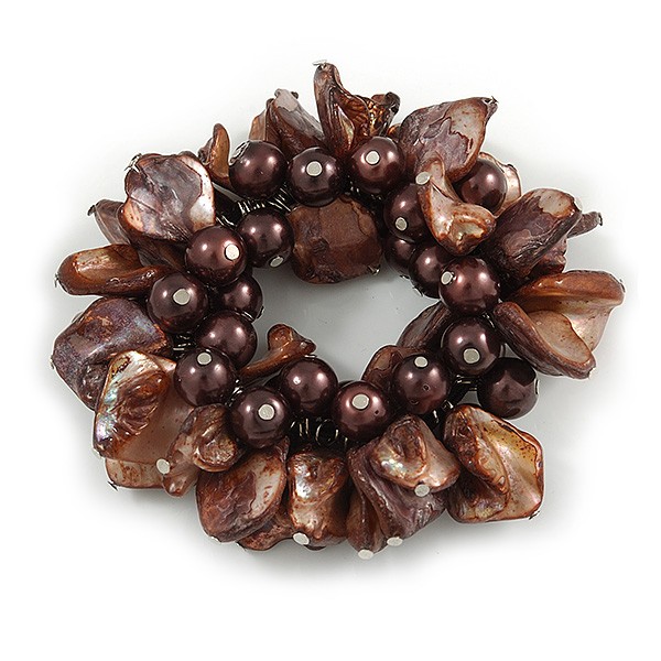 125g Chunky Brown Glass Beads and Shell Nuggets Flex Bracelet - 18cm L