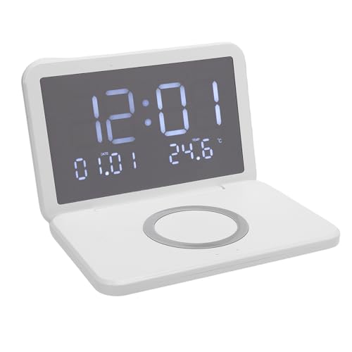 Sxhlseller 15W Wireless Charging Clock Flip Cover Design LED Mirror Electronic Clock with Fast Charging Pad for Nightstand Desk Makeup Mirror (White)