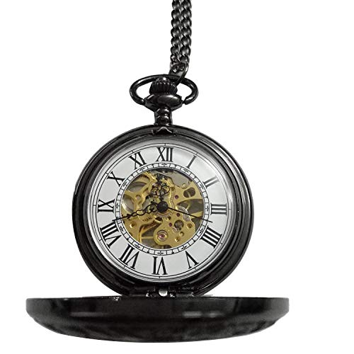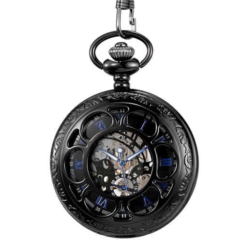 MKEMQXBEP Mechanical Hand Wind Pocket Watches Roman Numeral Dial Skeleton Flip Men Clock(Black 1PC)