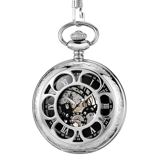 MKEMQXBEP Mechanical Hand Wind Pocket Watches Roman Numeral Dial Skeleton Flip Men Clock(Silver 1PC)