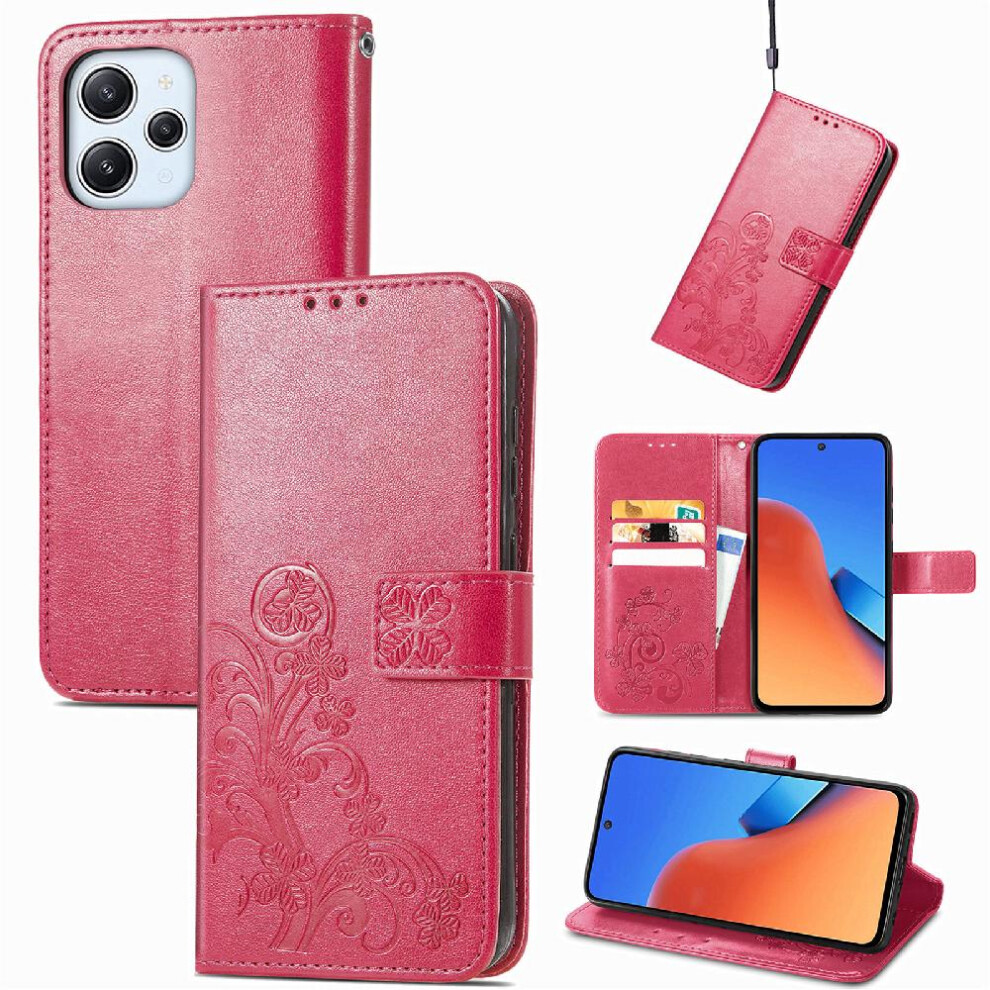 (Pink) Case For Xiaomi Redmi 12 Leather Case Flip Cover Four Leaf Clover Short Strap Exquisite Business