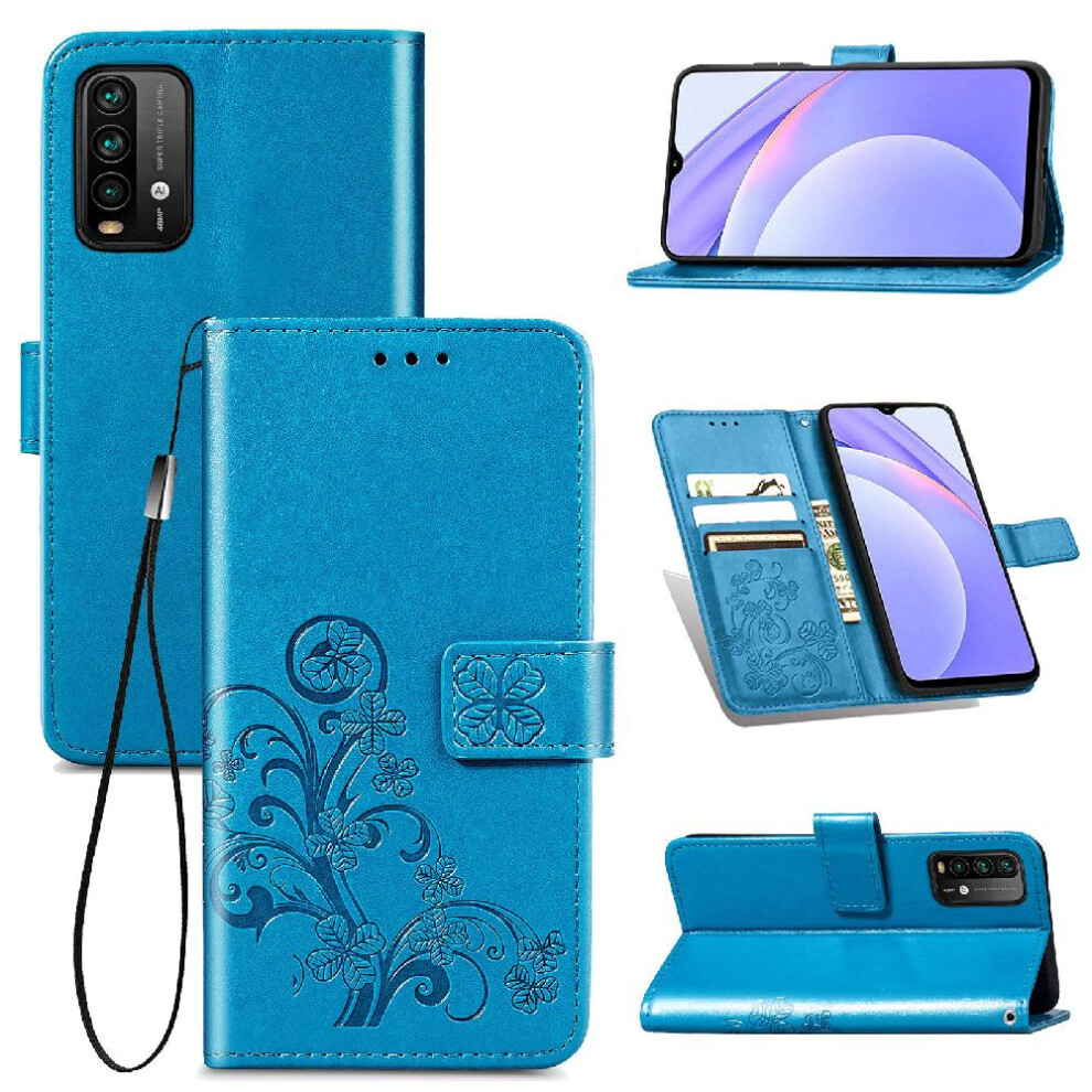 (Blue) Case For Xiaomi Redmi Note 9 4G Flip Cover Four Leaf Clover Exquisite Business Leather Case Short Strap