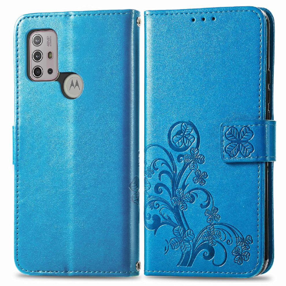 (Blue) Case For Motorola MOTO G10 Flip Cover Four Leaf Clover Exquisite Business Leather Case Short Strap