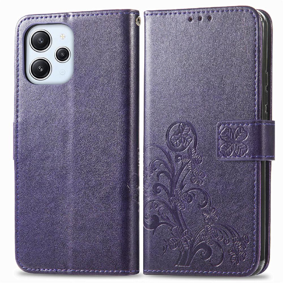 (Dark violet) Case For Xiaomi Redmi 12 Leather Case Flip Cover Four Leaf Clover Short Strap Exquisite Business