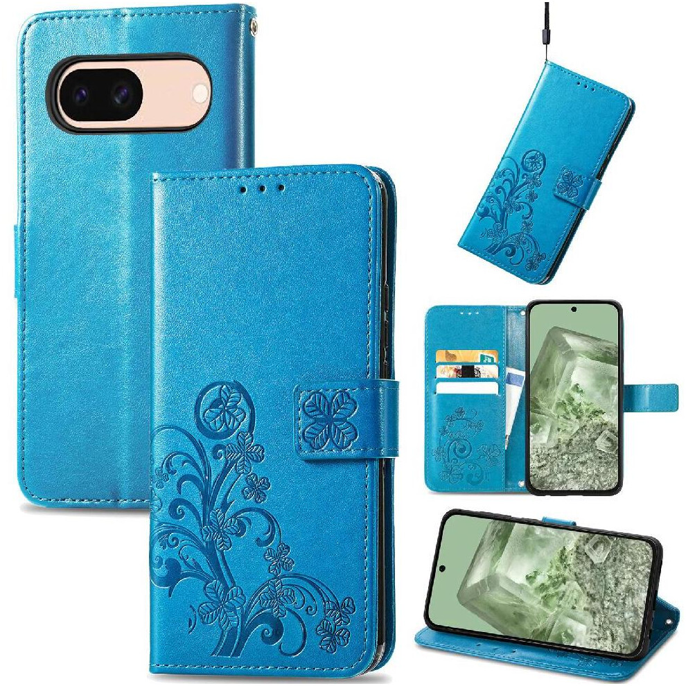 (Blue) Flip Case for Google Pixel 8a Leather Case Flip Cover Four Leaf Clover Exquisite Business Short Strap
