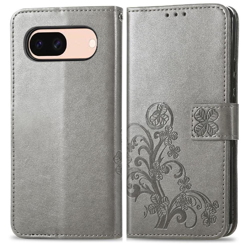(Gray ) Flip Case for Google Pixel 8a Leather Case Flip Cover Four Leaf Clover Exquisite Business Short Strap