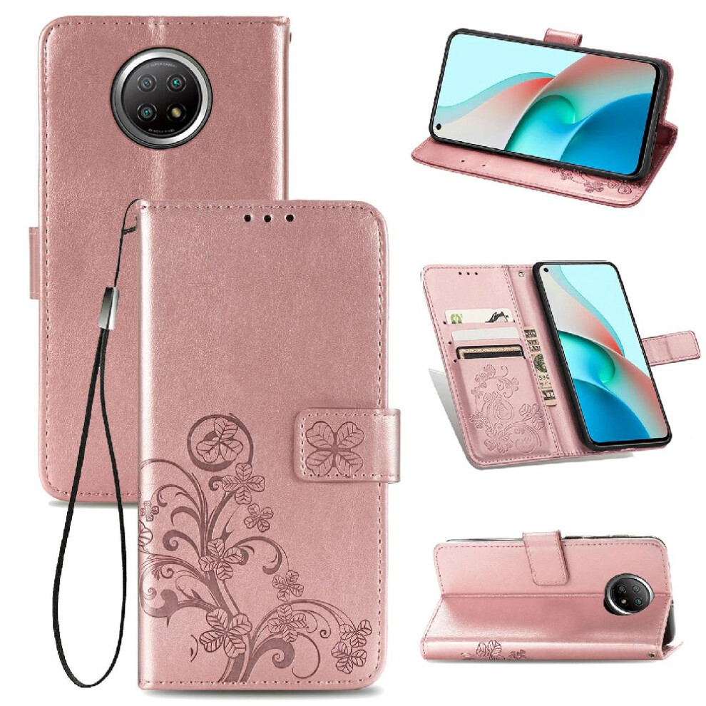 (Pink) Case For Xiaomi Redmi Note 9 5G Short Strap Exquisite Business Flip Cover Four Leaf Clover Leather Case