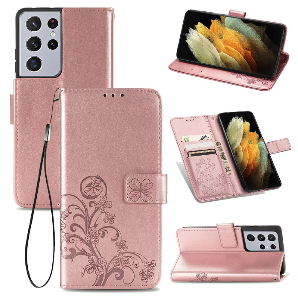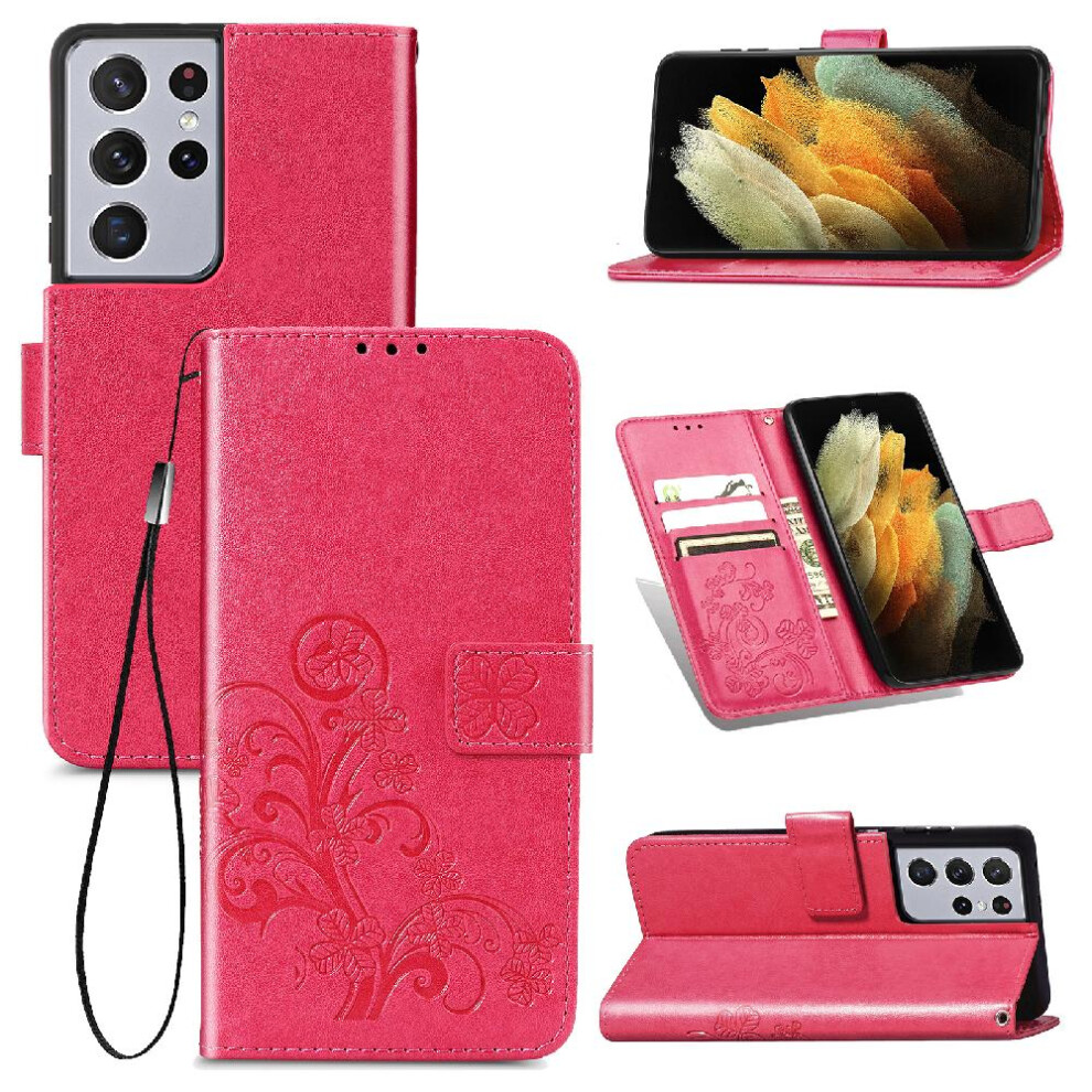 (Pink) Case For Samsung Galaxy S21 Ultra Leather Case Flip Cover Four Leaf Clover Exquisite Business Short Strap