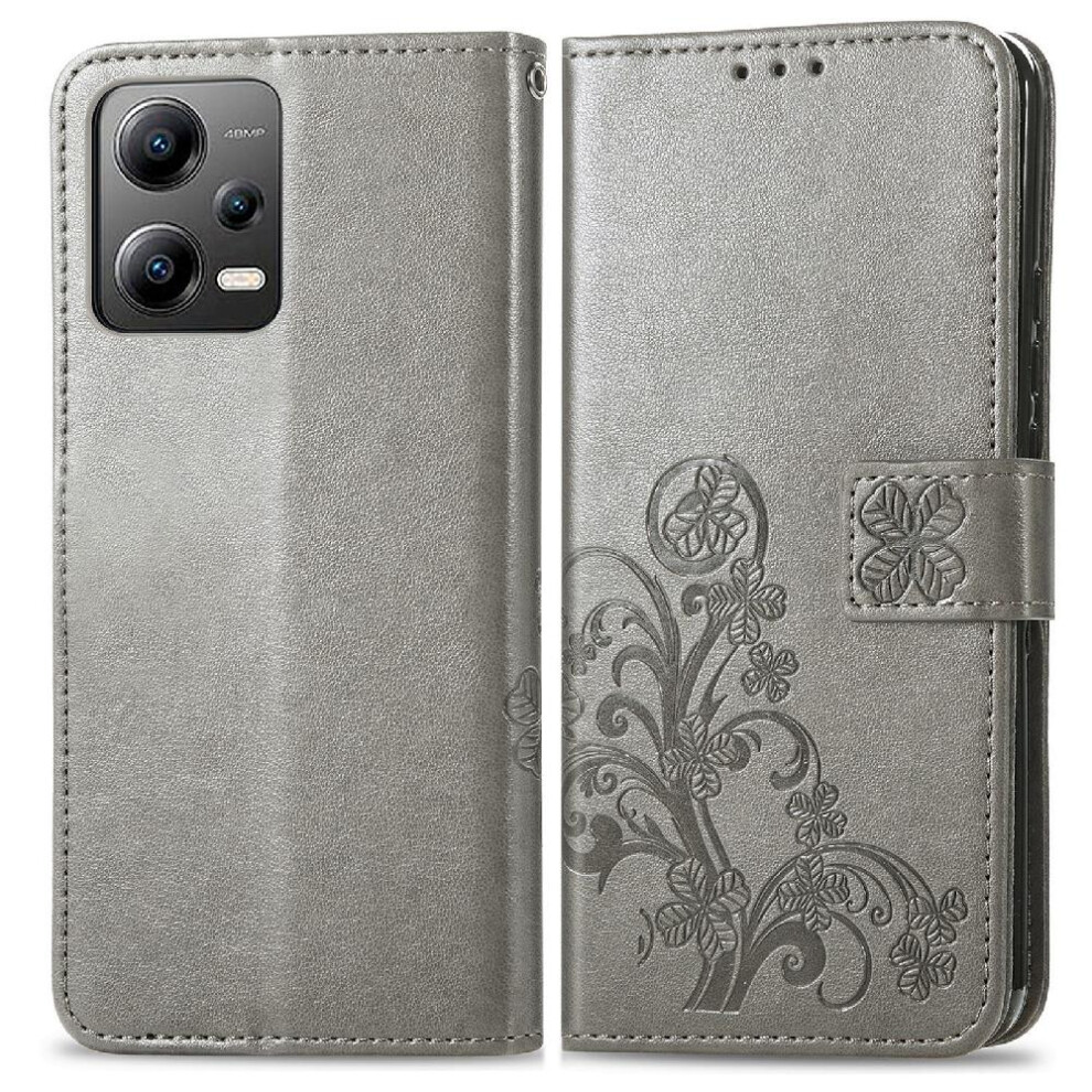 (Gray ) Case For Xiaomi POCO X5 Leather Case Exquisite Business Flip Cover Four Leaf Clover Short Strap
