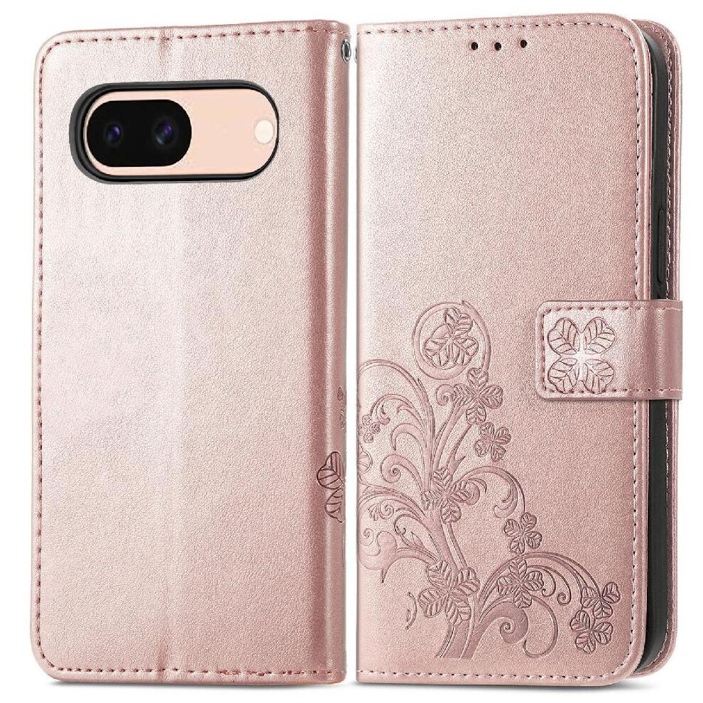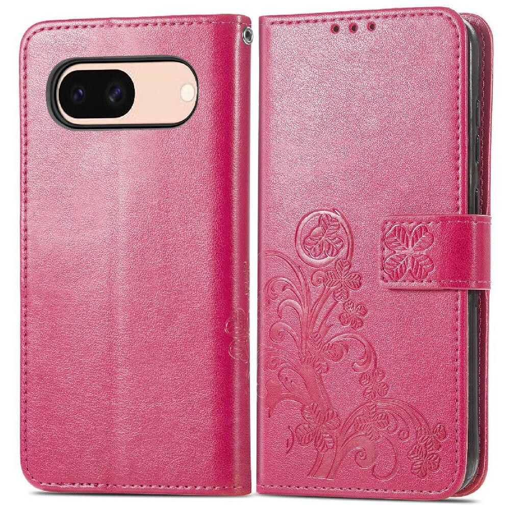 (Pink) Flip Case for Google Pixel 8a Leather Case Flip Cover Four Leaf Clover Exquisite Business Short Strap