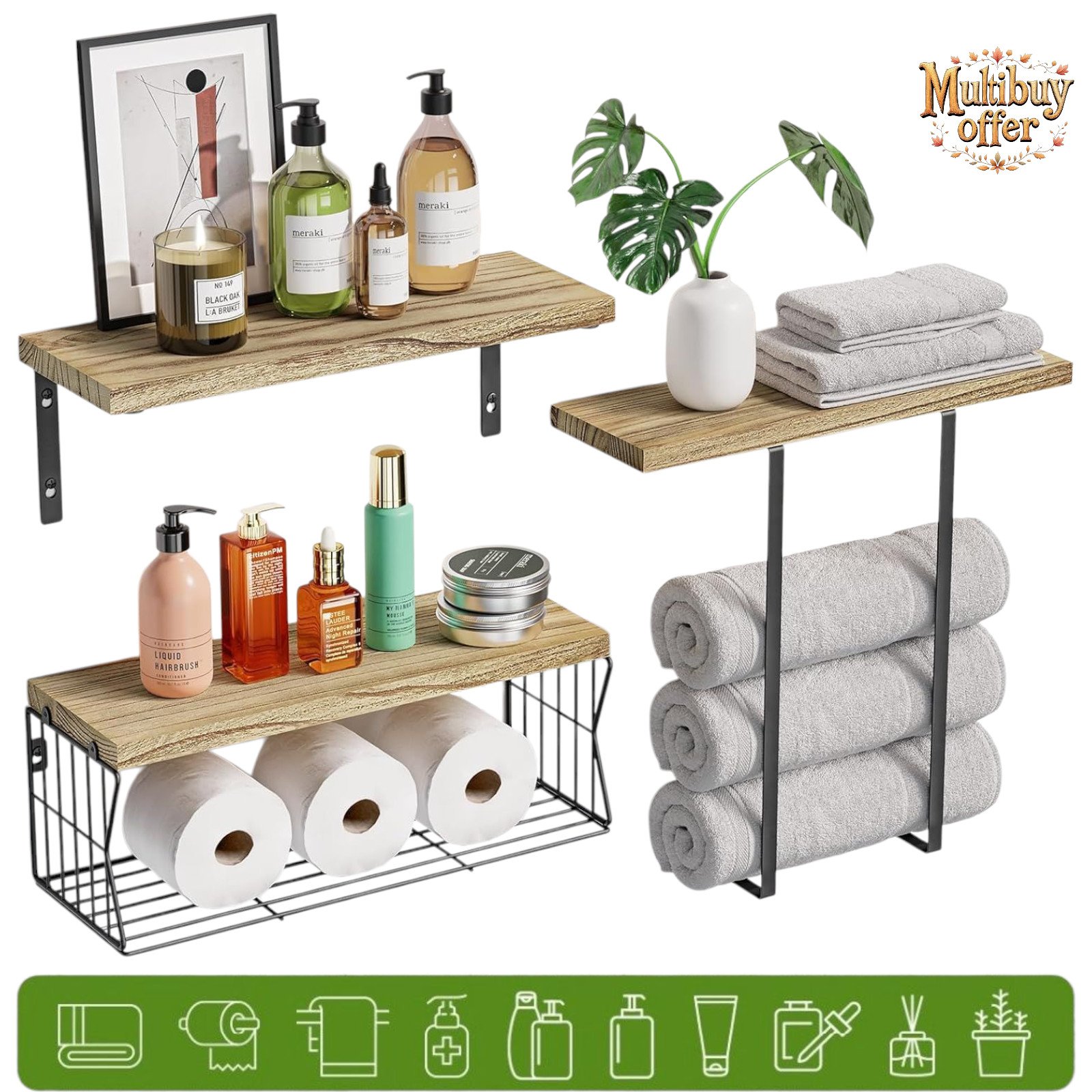 3+2 Tier Wooden Floating Shelves with Towel Rack & Paper Holder Solid Wood Wall