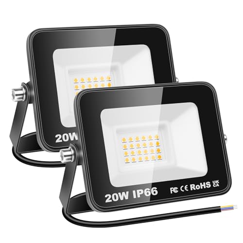 PICAA 2PCS 20W LED Flood Lights Outdoor, Super Bright Security Lights, IP66 Waterproof Floodlight, Warm White (3500K) Wall Light, Perfect for Garden, Yard, Garage, Patio,Warehouse, Parking Lot