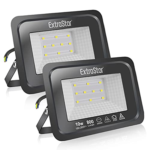 EXTRASTAR 10W LED Floodlight Outdoor, 800LM Super Bright LED Security Lights, IP65 Waterproof Flood Light Wall Lights for Garden, Garage, Warehouse, Backyard and More - 6500K Daylight, 2 Pack