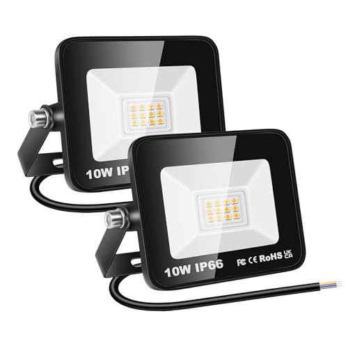 PICAA 2PCS 10W LED Flood Lights Outdoor, Super Bright Security Lights, IP66 Waterproof Floodlight, Warm White (3500K) Wall Light, Perfect for Garden, Yard, Garage, Patio,Warehouse, Parking Lot