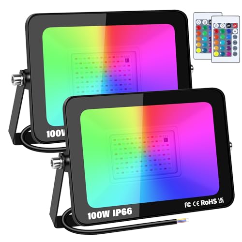 RIGIDON 2 Pack Outdoor RGB LED Floodlight, 100W Dimmable 16 Colour Changing Flood Lights for Garden, Courtyard, Landscap, Stage Decoration, IP66, Electric Mains Powered, Remote Control, 175-265V