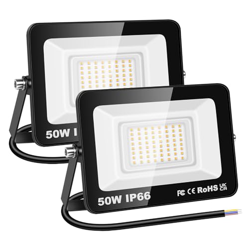 RIGIDON 2 Pcs Outdoor Flood LED Work Light, 50W 5000 Lumens Floodlight, Daylight Warm White Security Lights for Garden Yard Lawn Basketball Football Court Patio Landscape, IP66 Waterproof 3000K