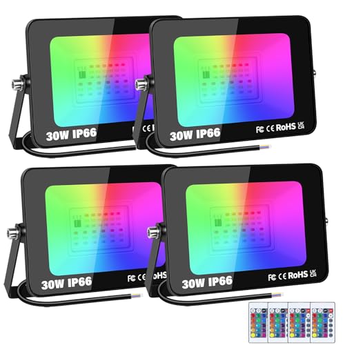 RIGIDON 4 Pack Outdoor RGB LED Floodlight, 30W Dimmable 16 Colour Changing Flood Lights for Garden, Courtyard, Landscap, Stage Decoration, IP66, Electric Mains Powered, Remote Control, 175-265V