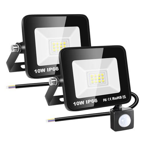 RIGIDON 2 Pcs PIR Motion Sensor Outdoor Security Light, 10W 1000 Lumens Outside Led Floodlight, Cold White Wall Light for Garden Garage Backyard Patio House Doorway, IP66 Waterproof 6000K