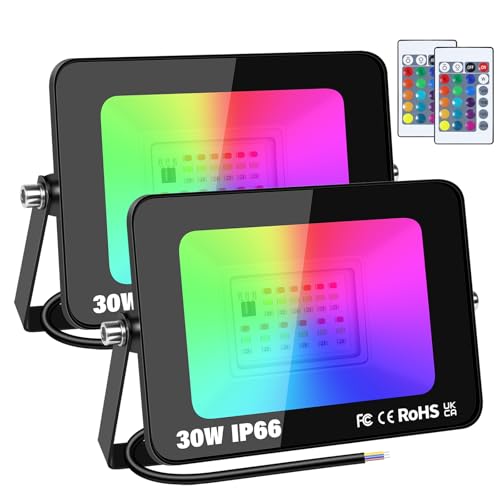 RIGIDON 2 Pack Outdoor RGB LED Floodlight, 30W Dimmable 16 Colour Changing Flood Lights for Garden, Courtyard, Landscap, Stage Decoration, IP66, Electric Mains Powered, Remote Control, 175-265V