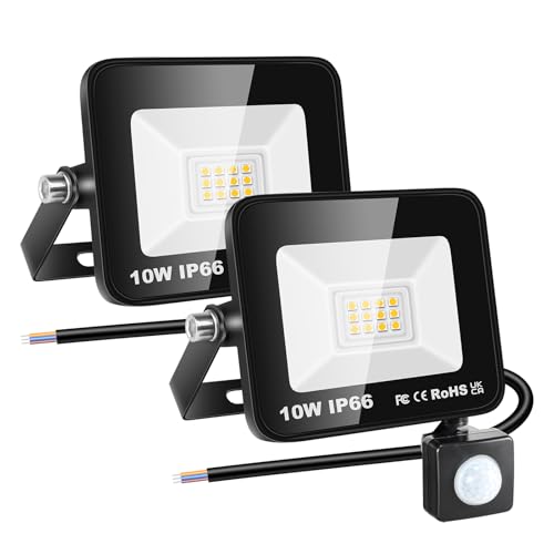 RIGIDON 2 Pcs PIR Motion Sensor Outdoor Security Light, 10W 1000 Lumens Outside Led Floodlight, Daylight Warm White Wall Light for Garden Garage Backyard Patio House Doorway, IP66 Waterproof 3000K