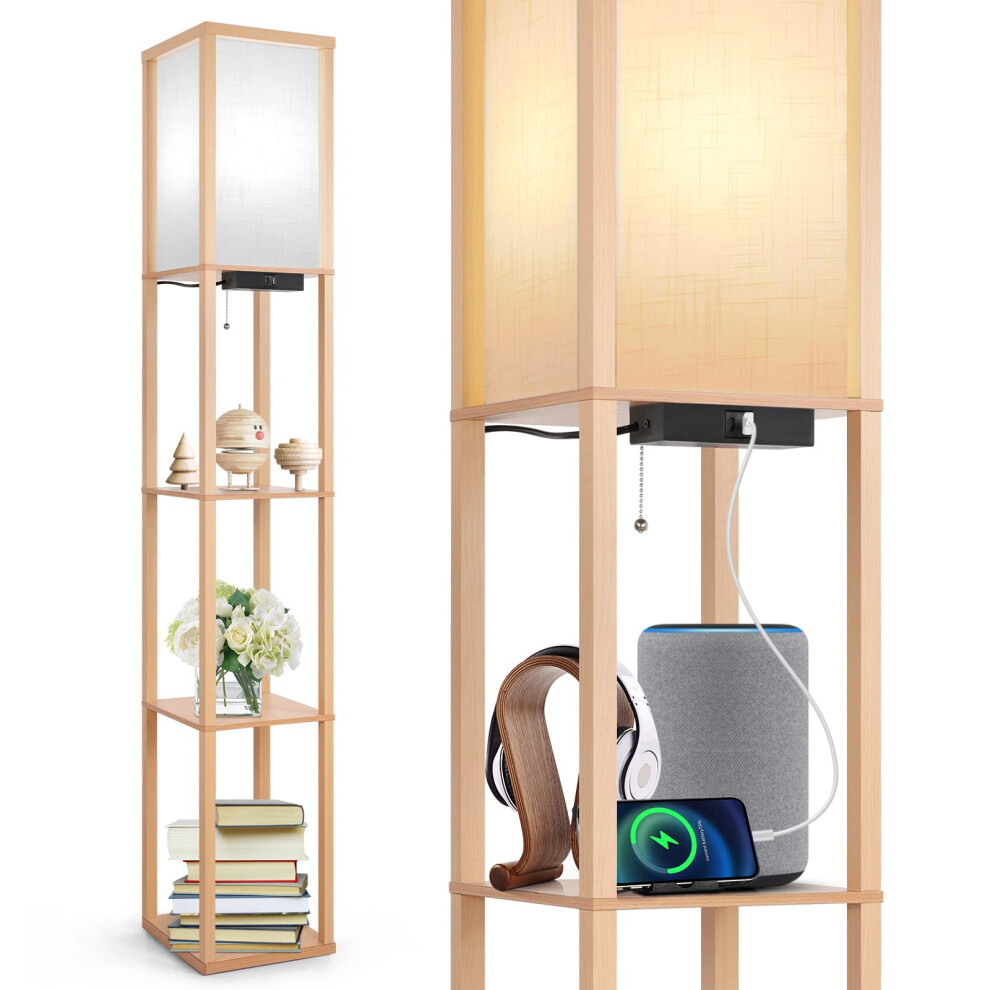 OUTON Floor Lamp with Shelves, LED Column Modern Floor Lamp with USB & Type C Port, 3 Color Temperature, Wooden Standing Lamp with White Linen Shade for Living Room, Bedroom, Office (Wood)
