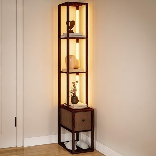 hnkhpkl 3-in-1 Floor Lamp With Storage, LED Standing Lamp With Shelves & Drawer, Dimmable Reading Lamp With Foot Switch, Rustic Brown Cabinet For Bathroom Bedroom Living Room