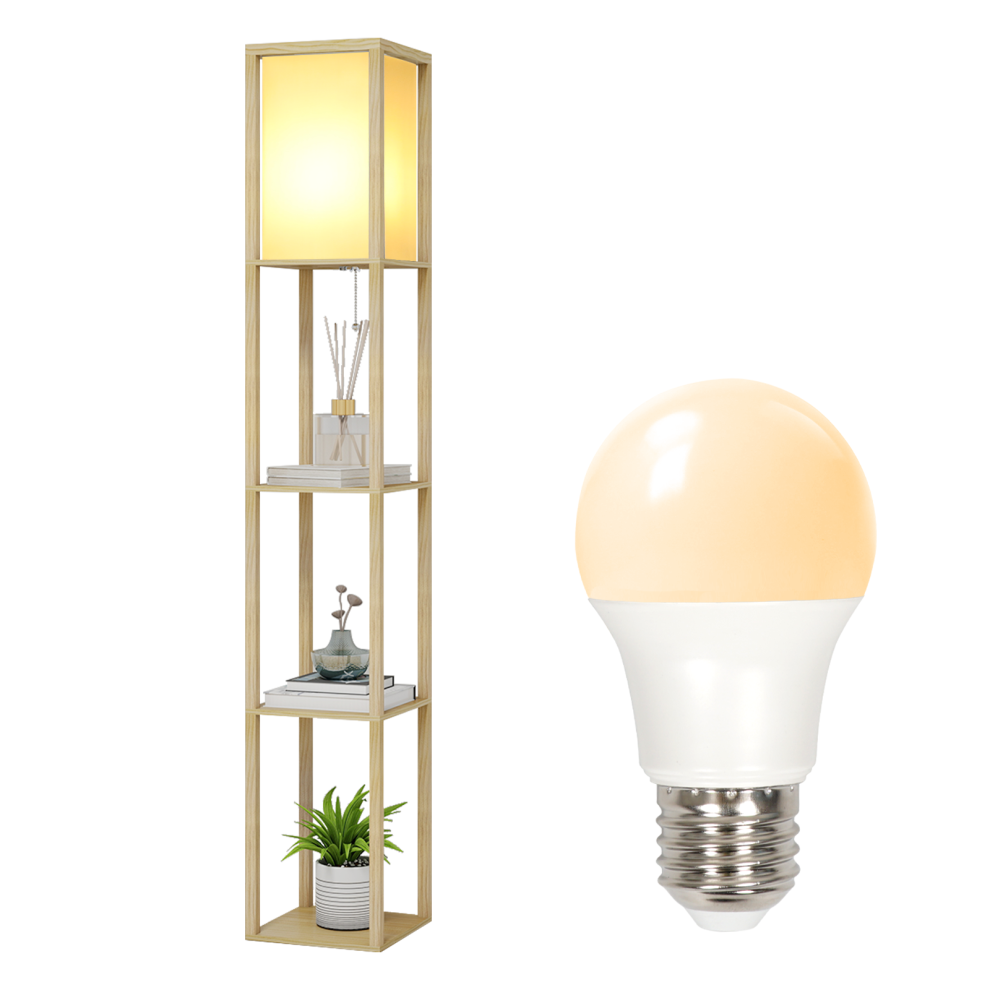 Modern Floor Lamp Wooden Shelf Storage with Bulb