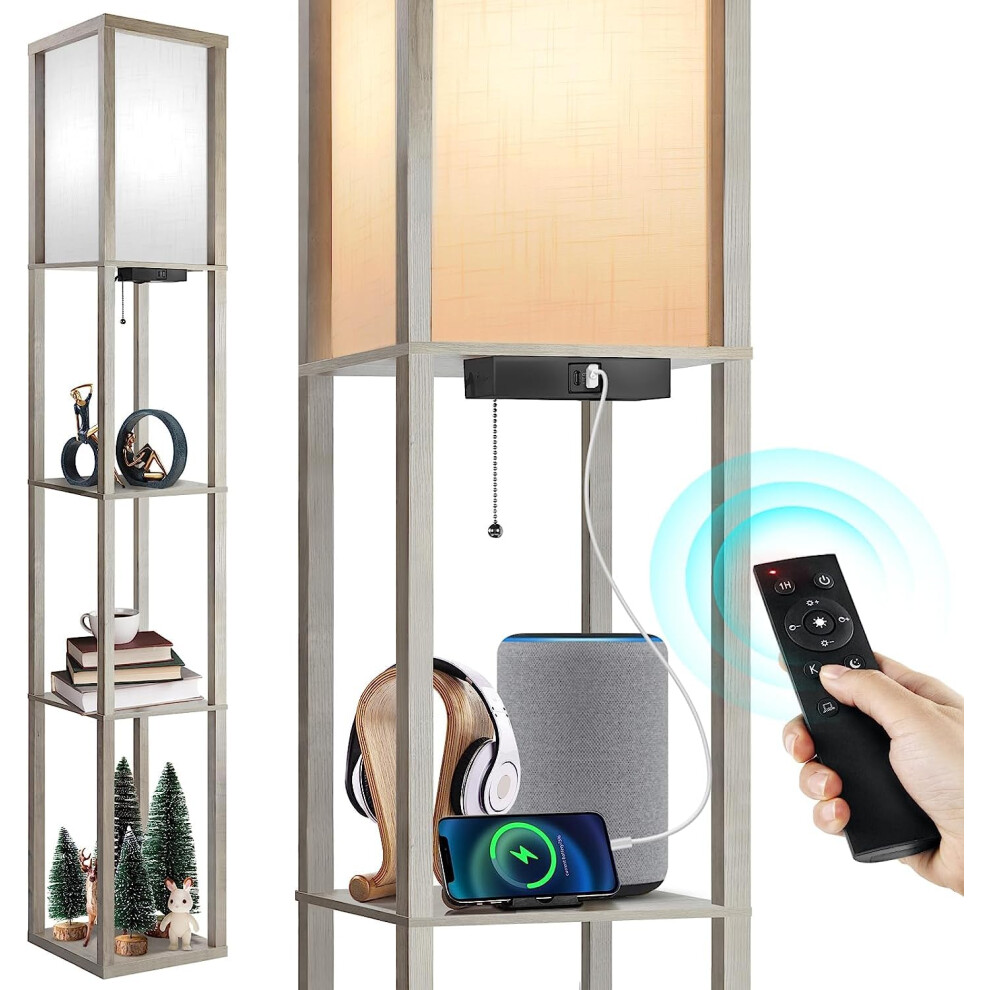 OUTON Floor Lamp Shelf with Remote Control, Dimmable & 4 Colour Temperature Adjustable, 1H Timer, LED Floor Lamp with 2 USB Ports, Floor Lamps with Lampshade for Living Room, Bedroom, Office(Grey)