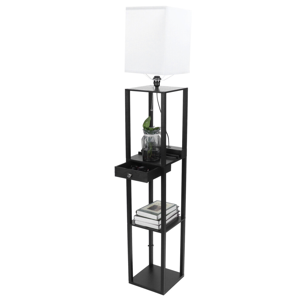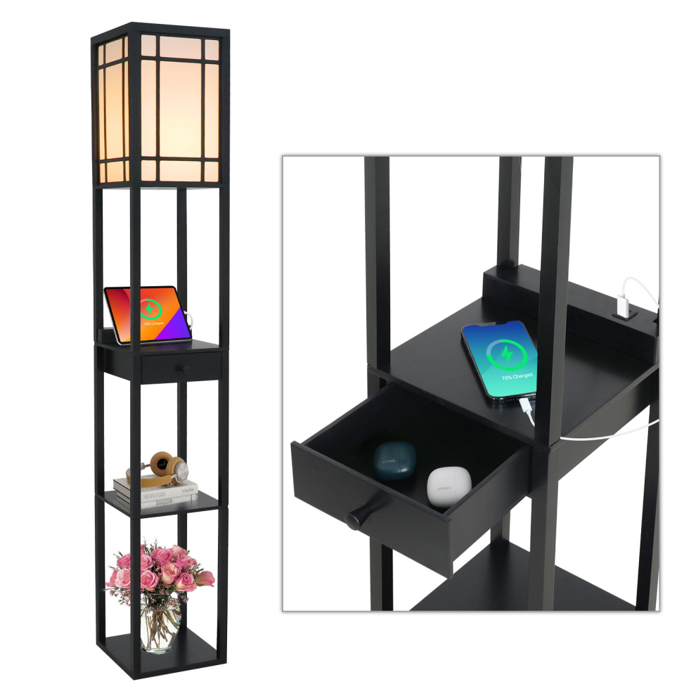 (Black(with a bulb, 2 USB, Drawer)) 3-Tier LED Floor Lamp Wooden Shelf with Storage