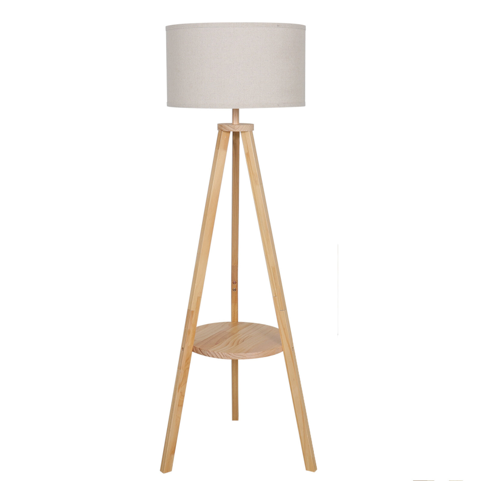 Solid Natural Wood Tripod Floor Lamp 154cm with Shelf, Beige Linen Shade 50x50cm