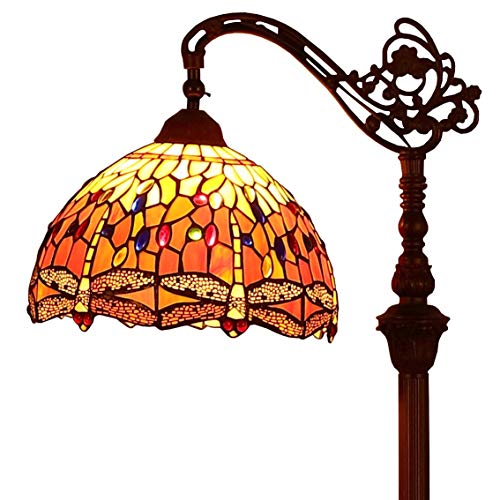Bieye L30713 Dragonfly Tiffany Style Stained Glass Floor Reading Lamp with 12 inches Wide Handmade Lamp Shade Metal Base for Living Room Bedroom, 62 inches Tall, Orange
