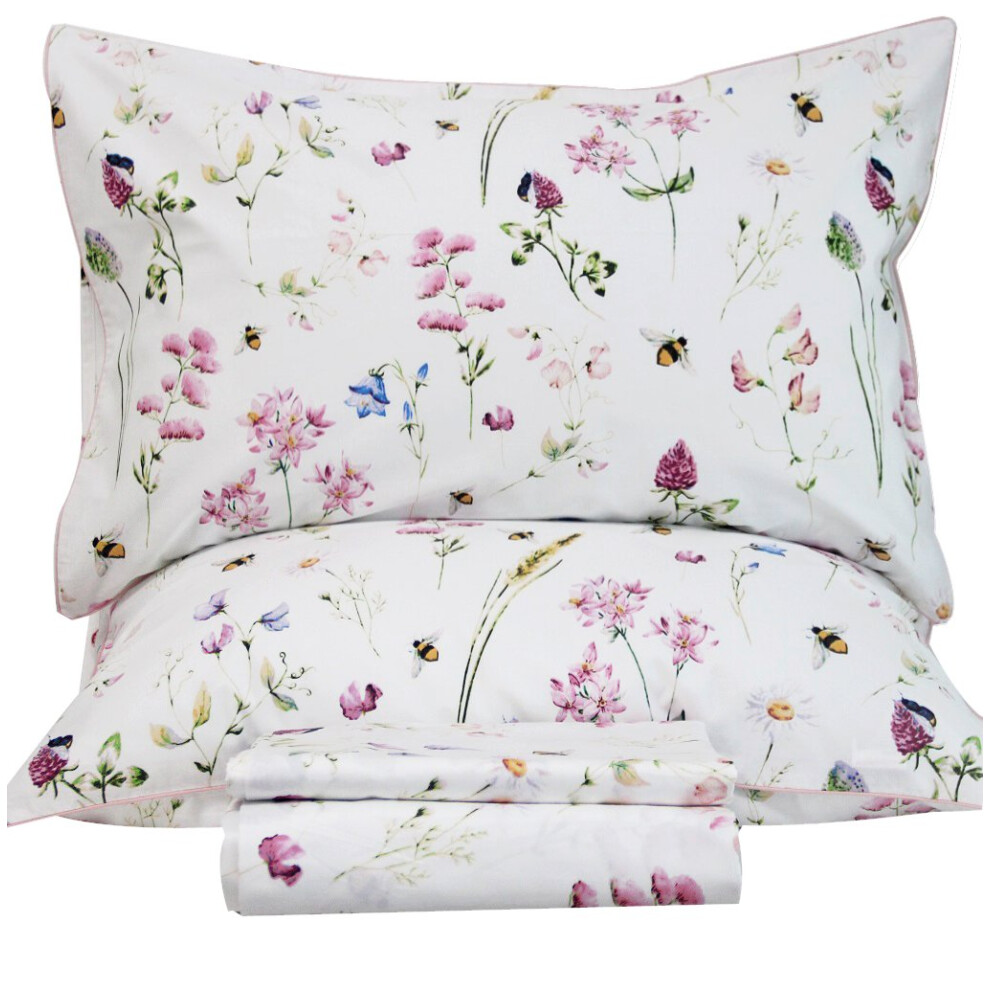 QSH Floral Bed Sheets Set King Size - Shabby Flower Bee Print Bed Sheet Set - Extra Soft and Breathable 100% Egyptian Cotton - 4 pcs King Size Sheets