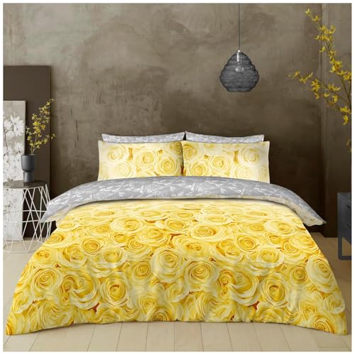 GC GAVENO CAVAILIA Premium Rose Duvet Cover King Size, Reversible Polycotton Bed Covers, Floral Bedding, Ochre
