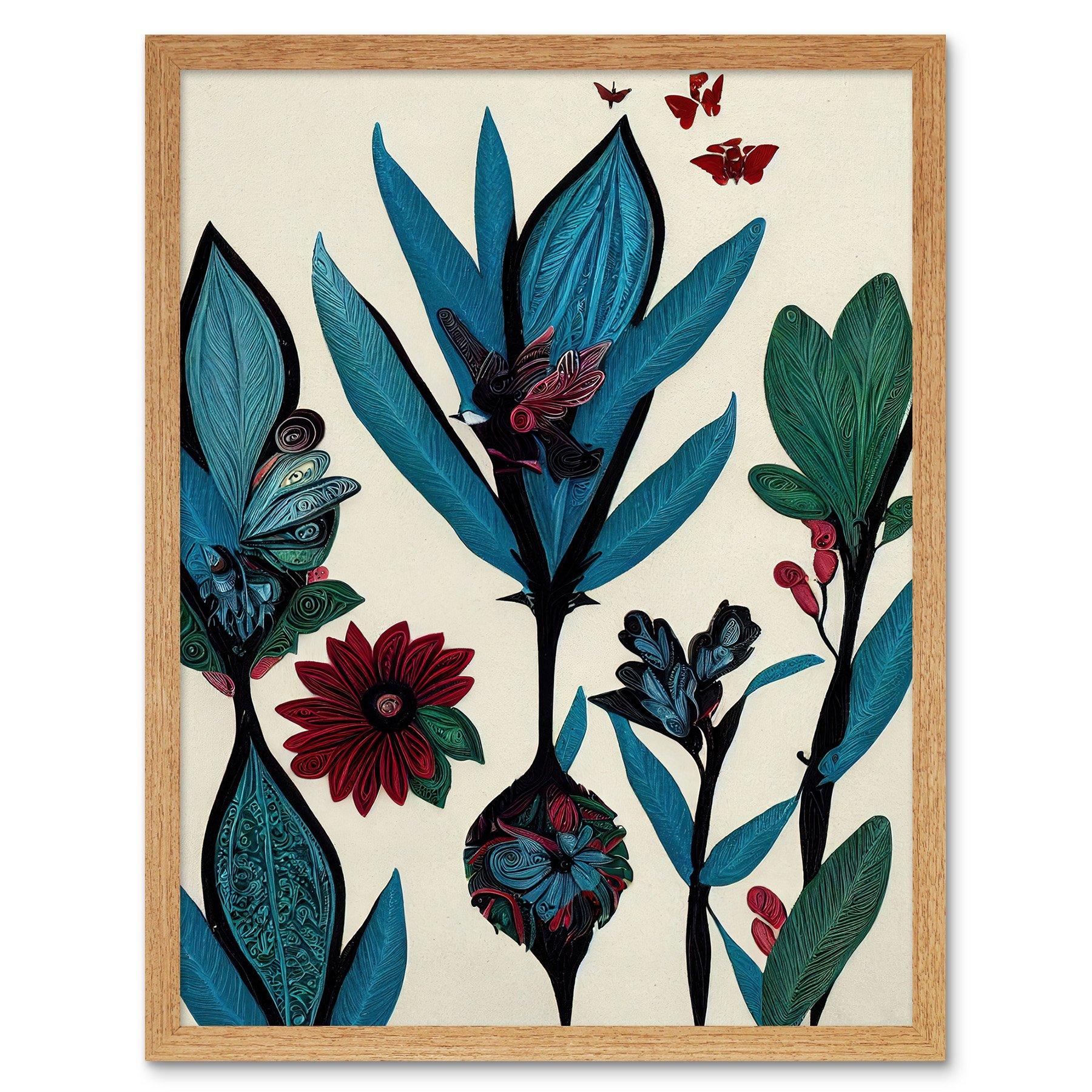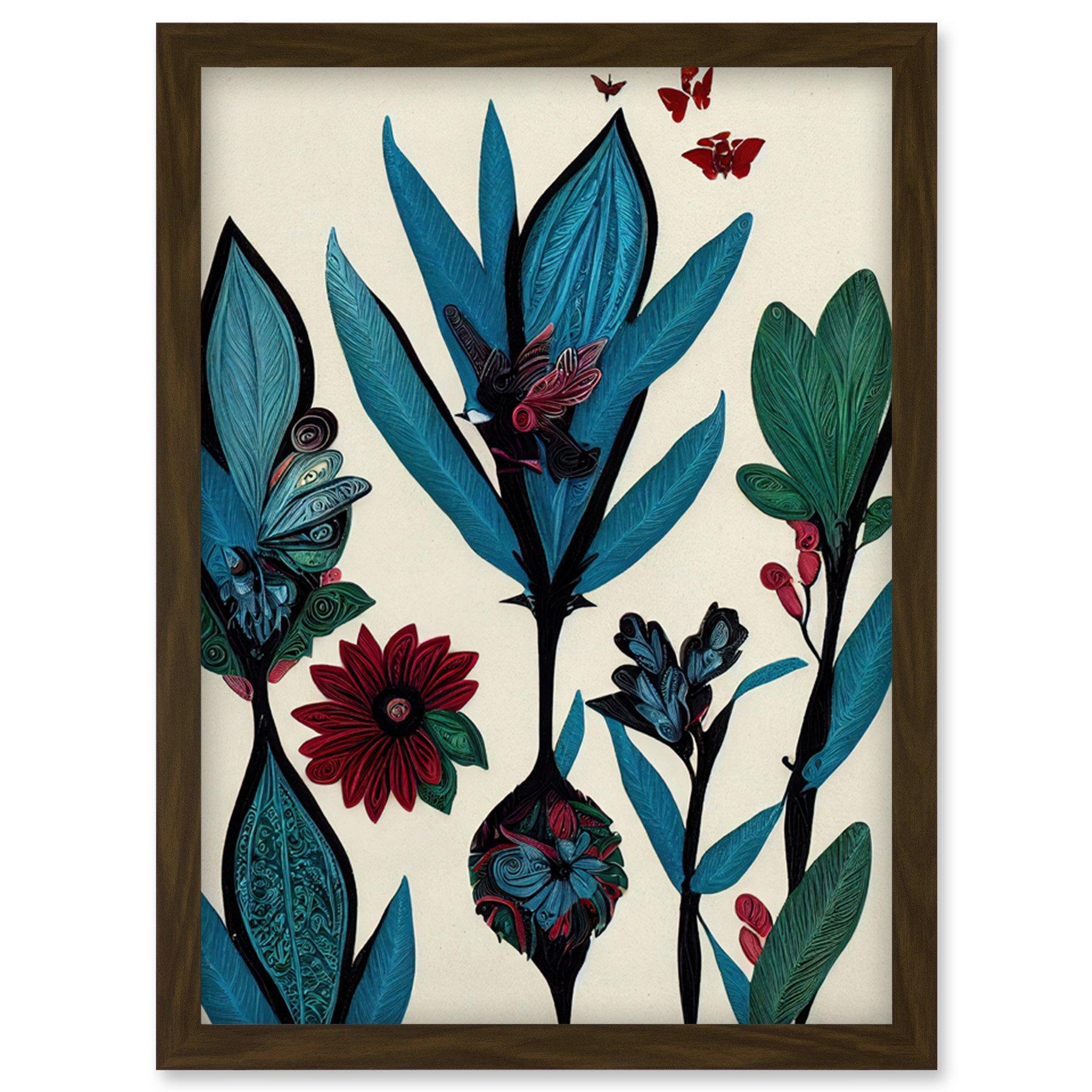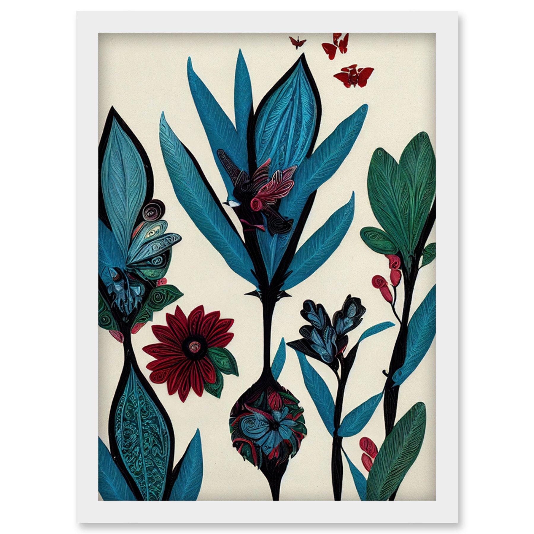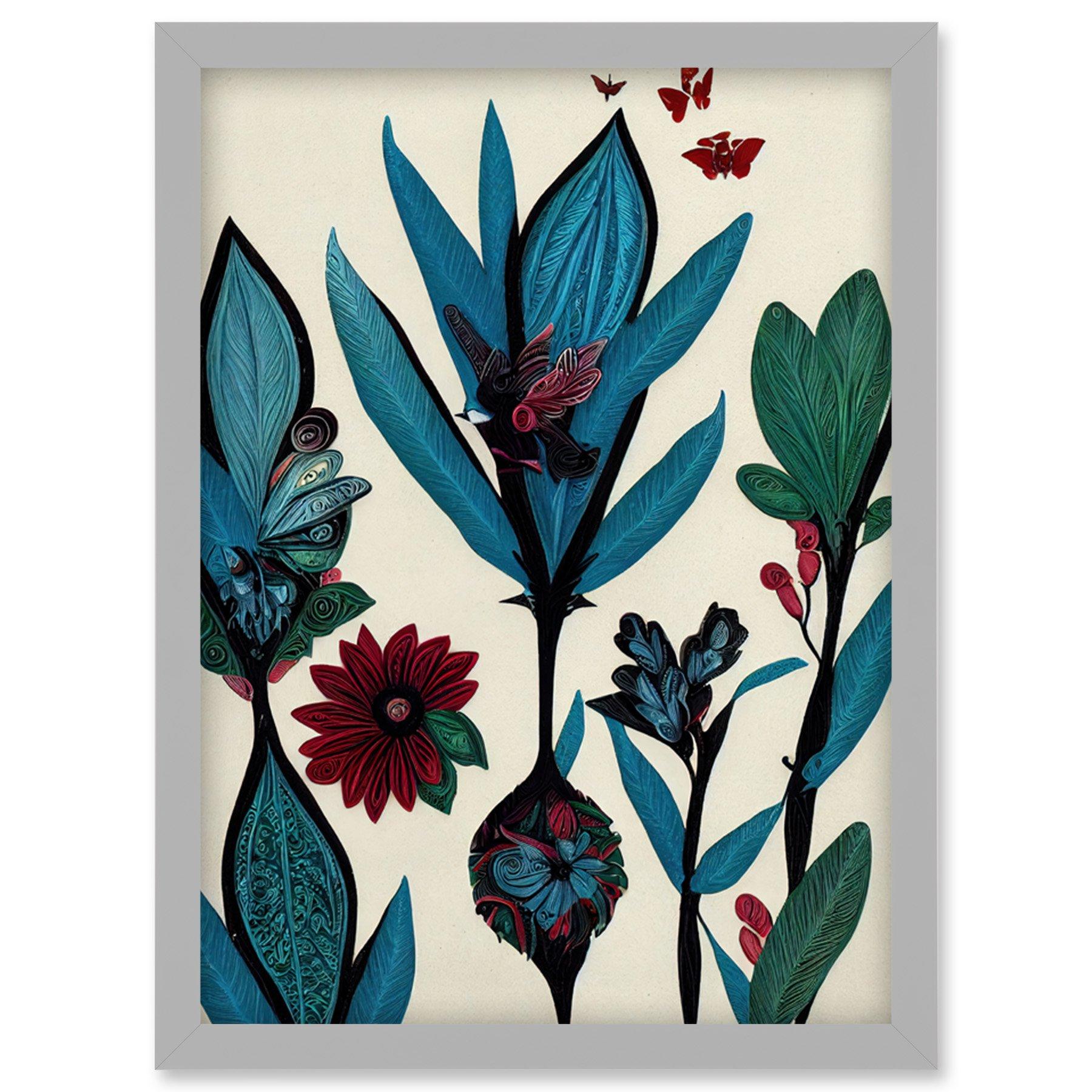 Abstract Paper Quilling Floral Blooms Flowers Butterflies Blue Burgundy Green Cream Artwork Framed Wall Art Print A4