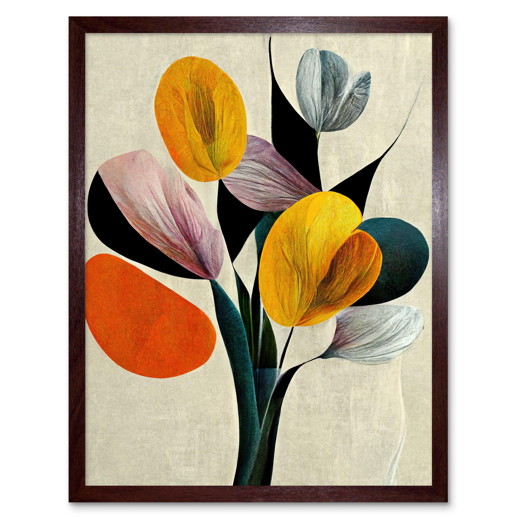 Abstract Retro Spring Summer Flowers Floral Yellow Burgundy Orange Bouquet Vase Art Print Framed Poster Wall Decor 12x16 inch