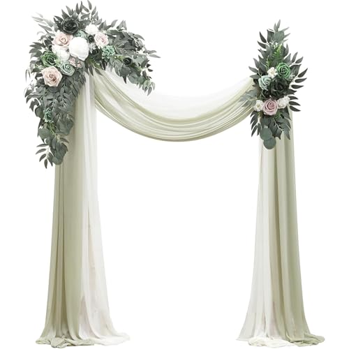 CCXJMLS 4 Pcs Wedding Arch Flowers and Drape Kit Include 2 Artificial Floral Swag and 2 White Chiffon Drapes, Faux Flower Set for DIY Wedding Party Reception Ceremony Backdrop Rose Decoration(L)