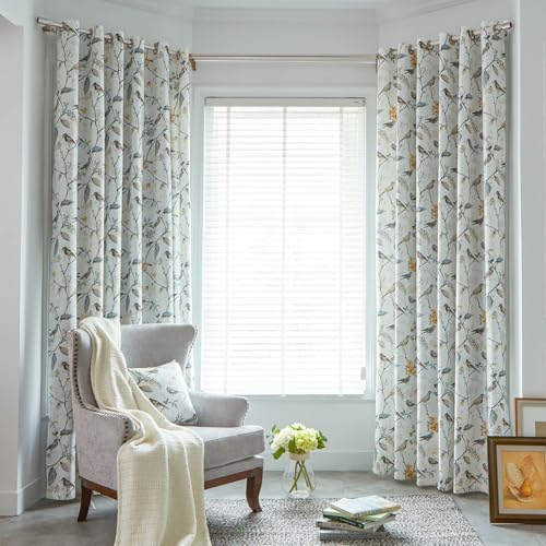 VOGOL Grey Eyelet Curtains 84 Inch Drop, Farmhouse Bird and Flower Print Drapes, Light Filtering Linen Textured Window Decor for Living Room Dining Room Bedroom, 52×84, 1 Panel