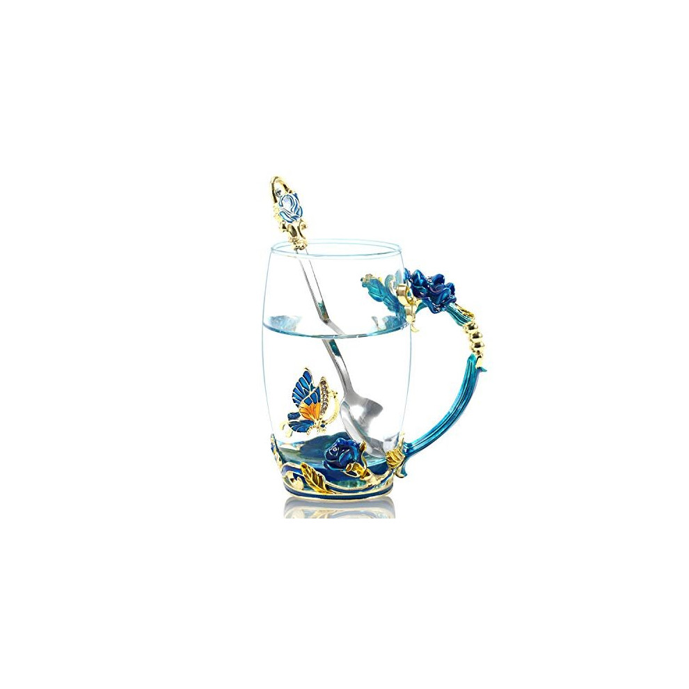 330ML Enamel Tea Cup Glass Coffee Mug Handmade Rose Flower Tea Mug for Valentines Day, Birthday, Christmas Gift with Stainless Steel Spoon Set