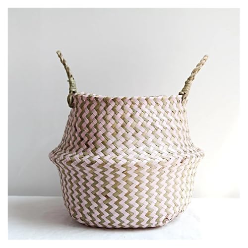 SAPIIKEF Boho Decor Striped Wicker Storage Baskets Handmade Collapsible Laundry Basket Patchwork Seaweed Flower Belly Garden Flower Pot(Pink and brown,27cmX24cm)