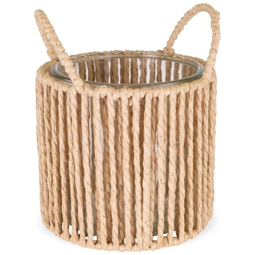 SAPIIKEF Boho Decor Striped Wicker Storage Baskets Handmade Collapsible Laundry Basket Patchwork Seaweed Flower Belly Garden Flower Pot(White and brown,23cmX20cm)