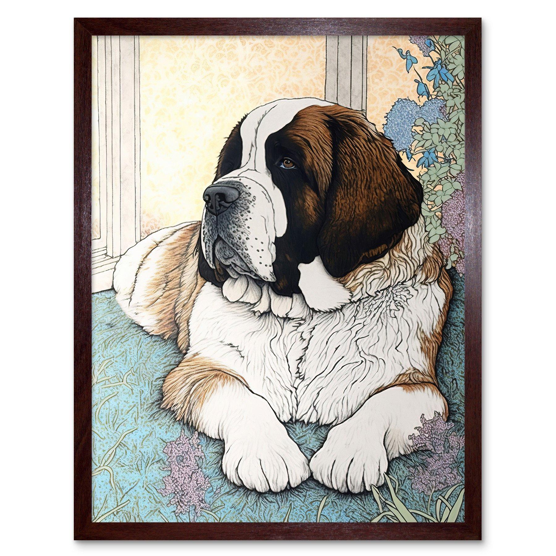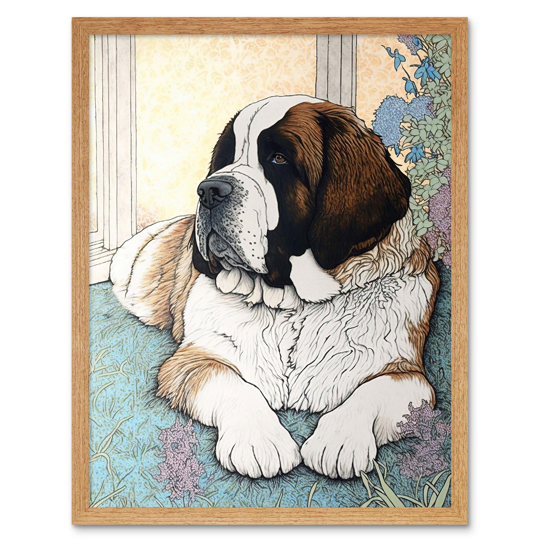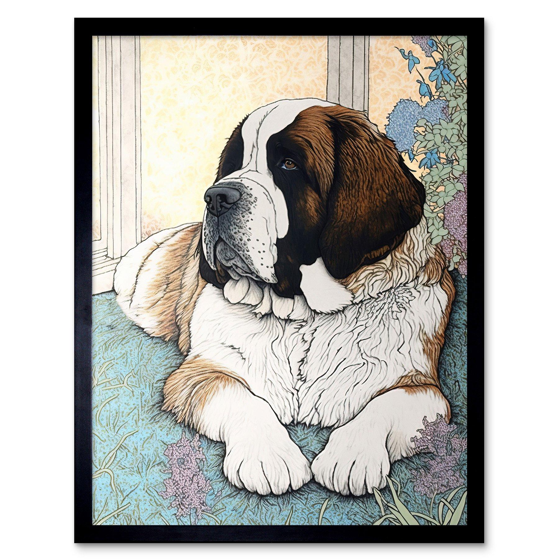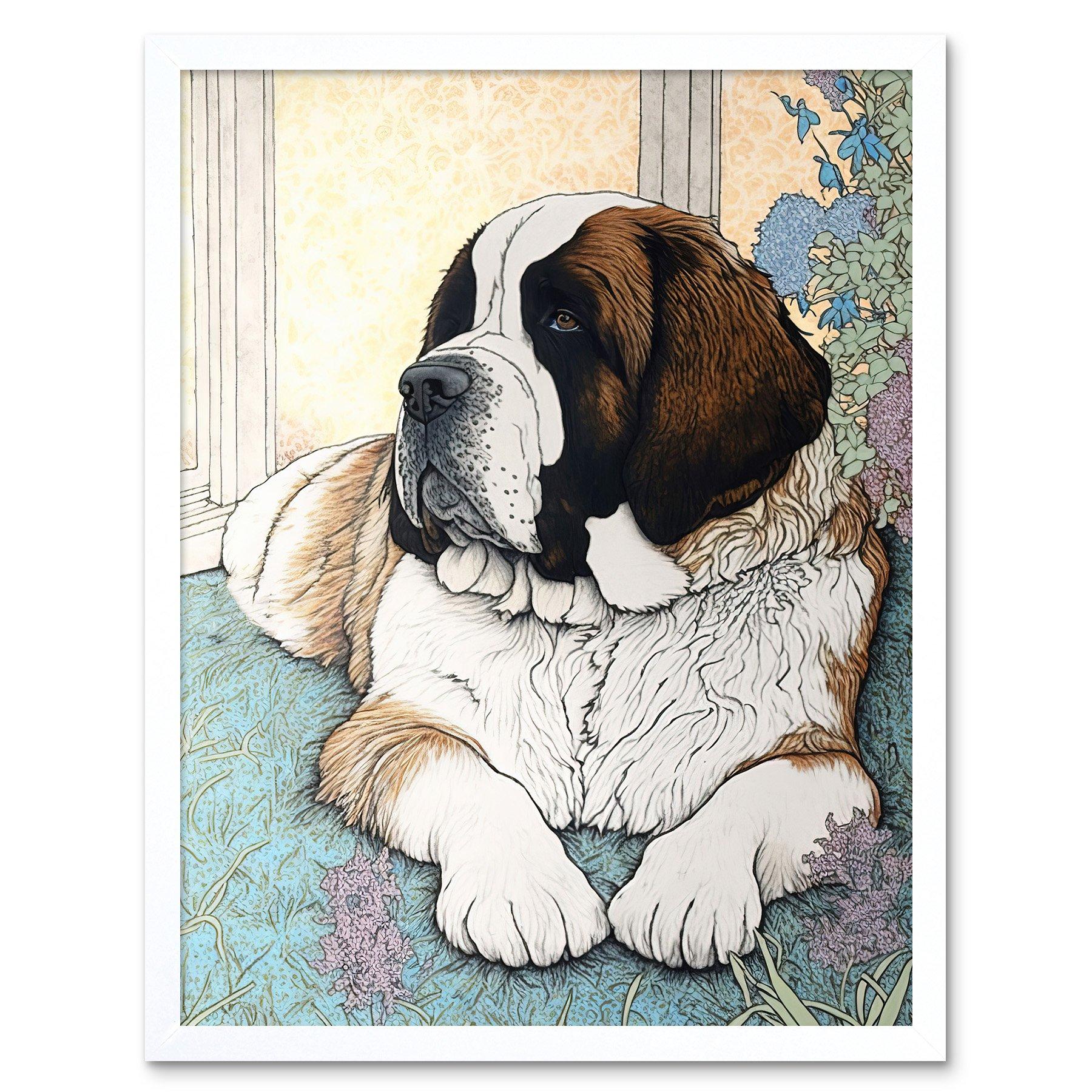 St Bernard Dog Lying by Flower Pot Modern Bright Multicoloured Illustration Art Print Framed Poster Wall Decor 12x16 inch