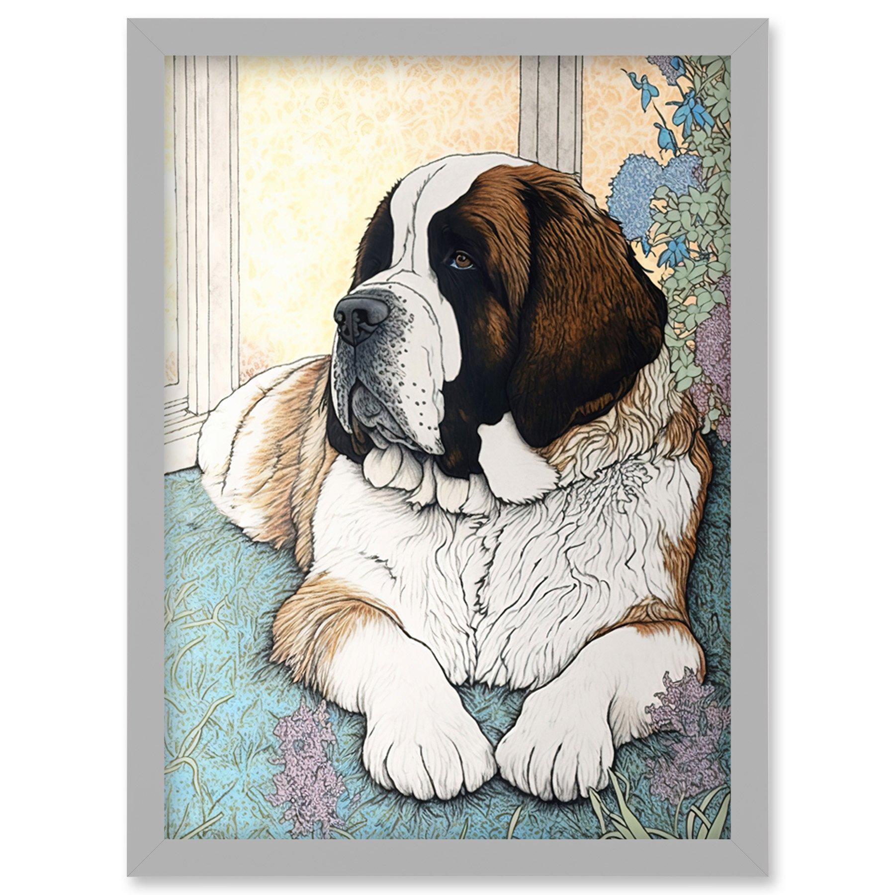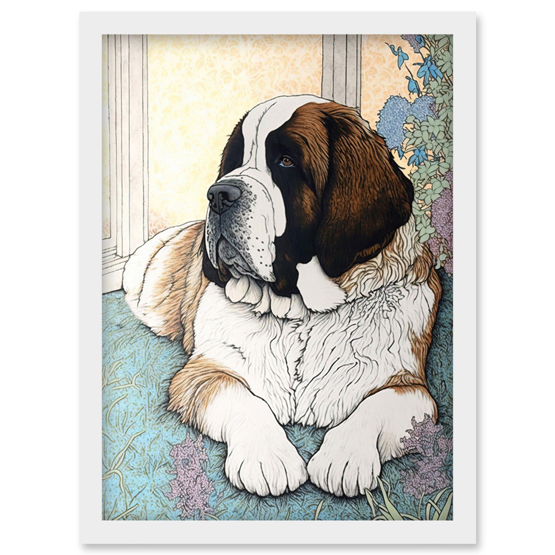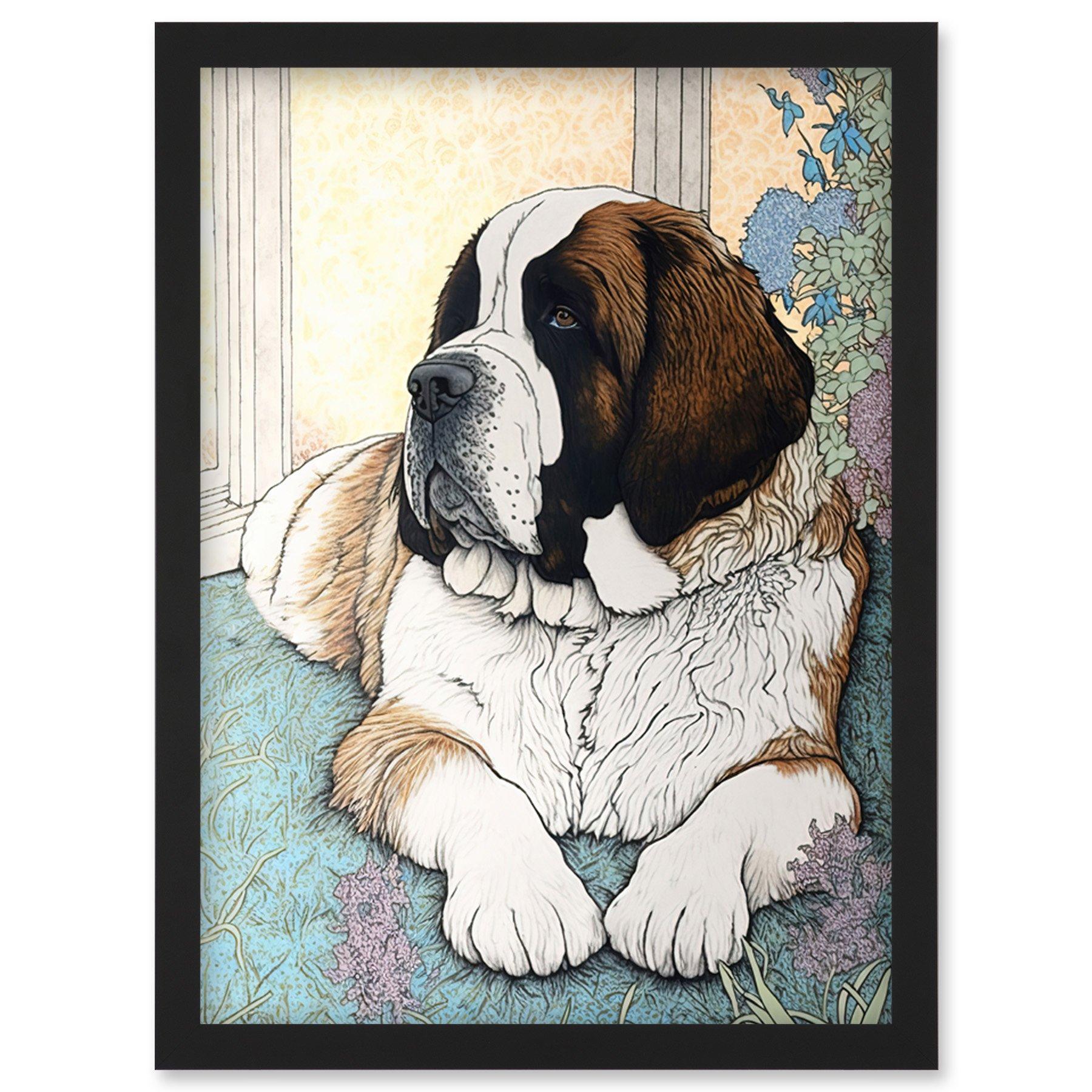 St Bernard Dog Lying by Flower Pot Modern Bright Multicoloured Illustration Artwork Framed Wall Art Print A4