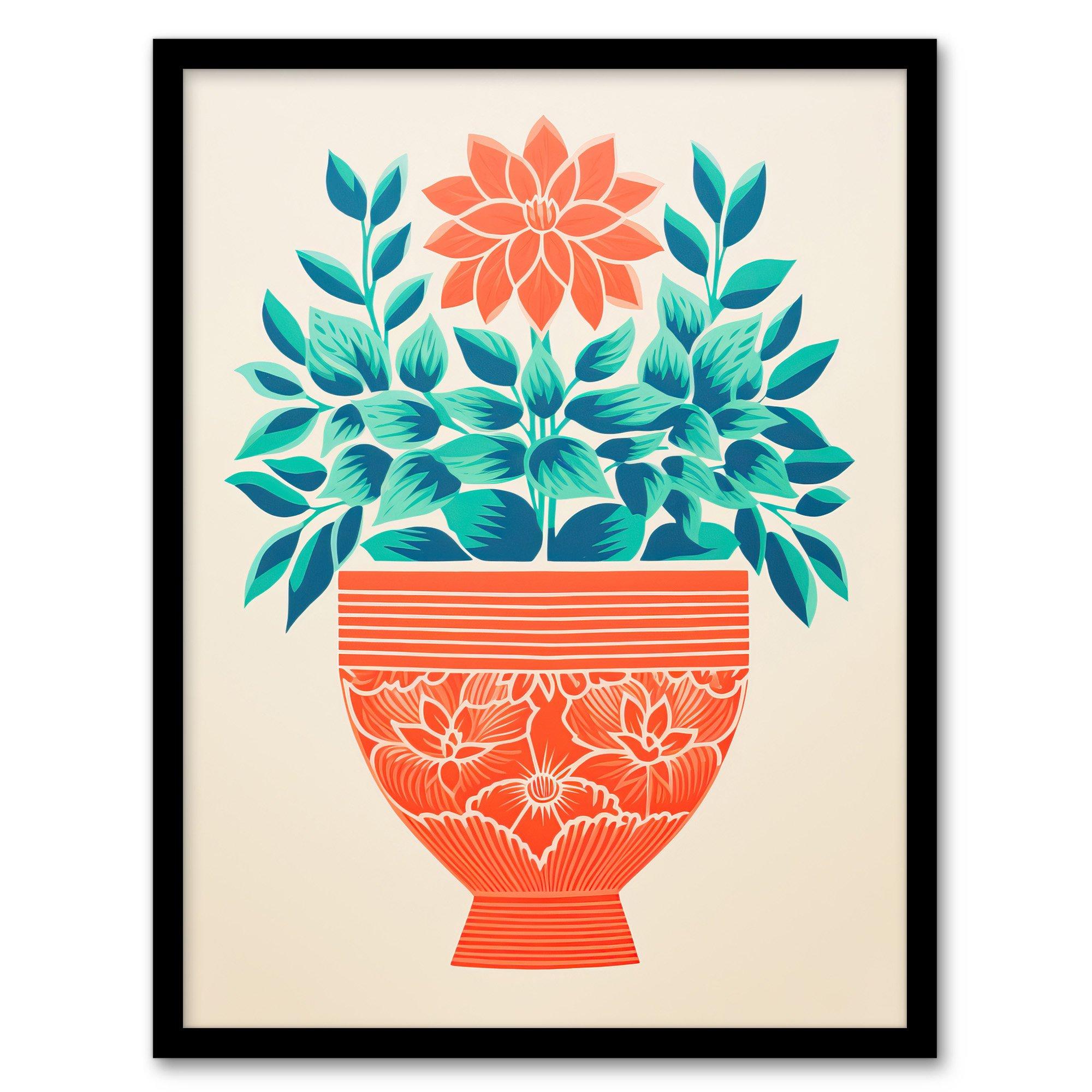 Ornate Coral Flower Pot Flowers Simple Bold Artwork Screen Print Vintage Art Print Framed Poster Wall Decor