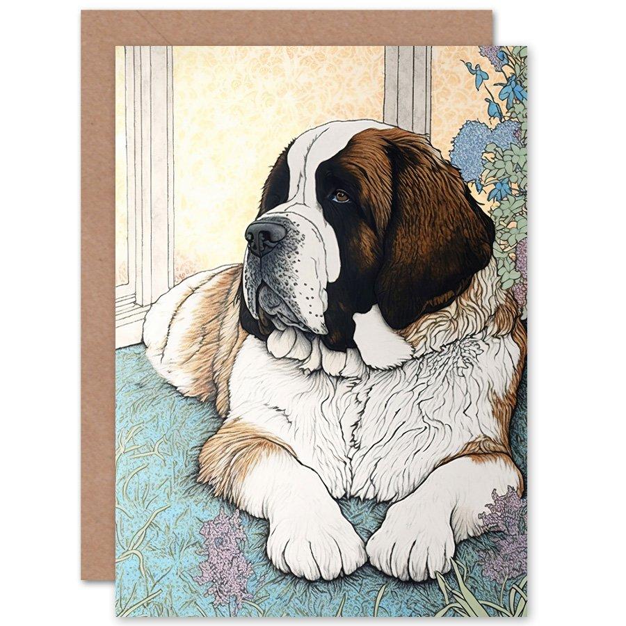 St Bernard Dog Lying by Flower Pot Modern Bright Multicoloured Illustration Art Birthday Sealed Greetings Card