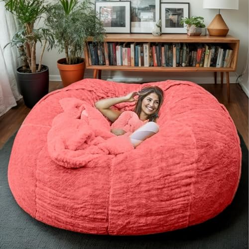 Giant Bean Bag Chair Cover(No Filler), Comfy Oversized Round Beanbag Chair, Big Round Soft Fluffy Faux Fur Bean Bag Lazy Sofa Bed Cover, for Living Room Bedroom Office (Red, 6F)