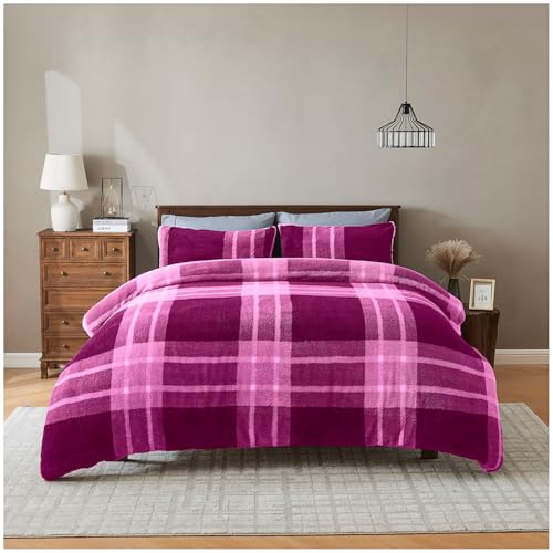 GC GAVENO CAVAILIA Teddy Fleece Duvet Set - Fluffy Check Duvet Cover with Pillowcase - Thermal Bedding Single Quilt Cover - Warm, Breathable & Hypoallergenic Bed Cover Set - (135x200 cm), Mulberry