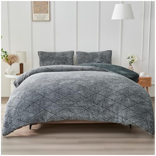 Lekesky Double Duvet Cover Set Teddy Fleece Bedding, Soft Warm Fleece Double Duvet Set (1x Fluffy Duvet Cover + 2x Pillowcases) Grey Fluffy Bedding 200x200 cm, Grey