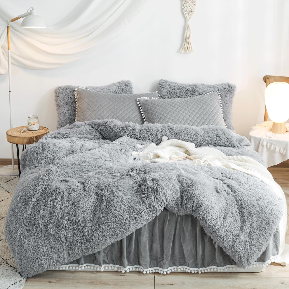 LIFEREVO Luxury Plush Shaggy Duvet Cover Set, Soft Velvet Fluffy Furry Duvet Cover Set(1 Faux Fur Fuzzy Comforter Cover + 1 Pom-poms Pillow Sham) Soli